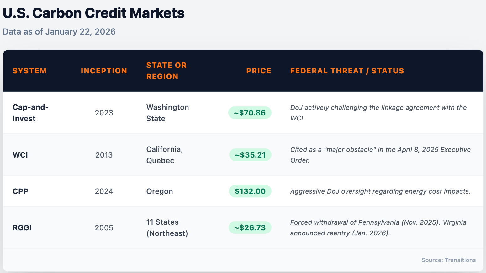 Our previous edition of Transitions explored federal energy policy and its potential failure to keep pace with surging electricity demand. Washington is also targeting local carbon markets.